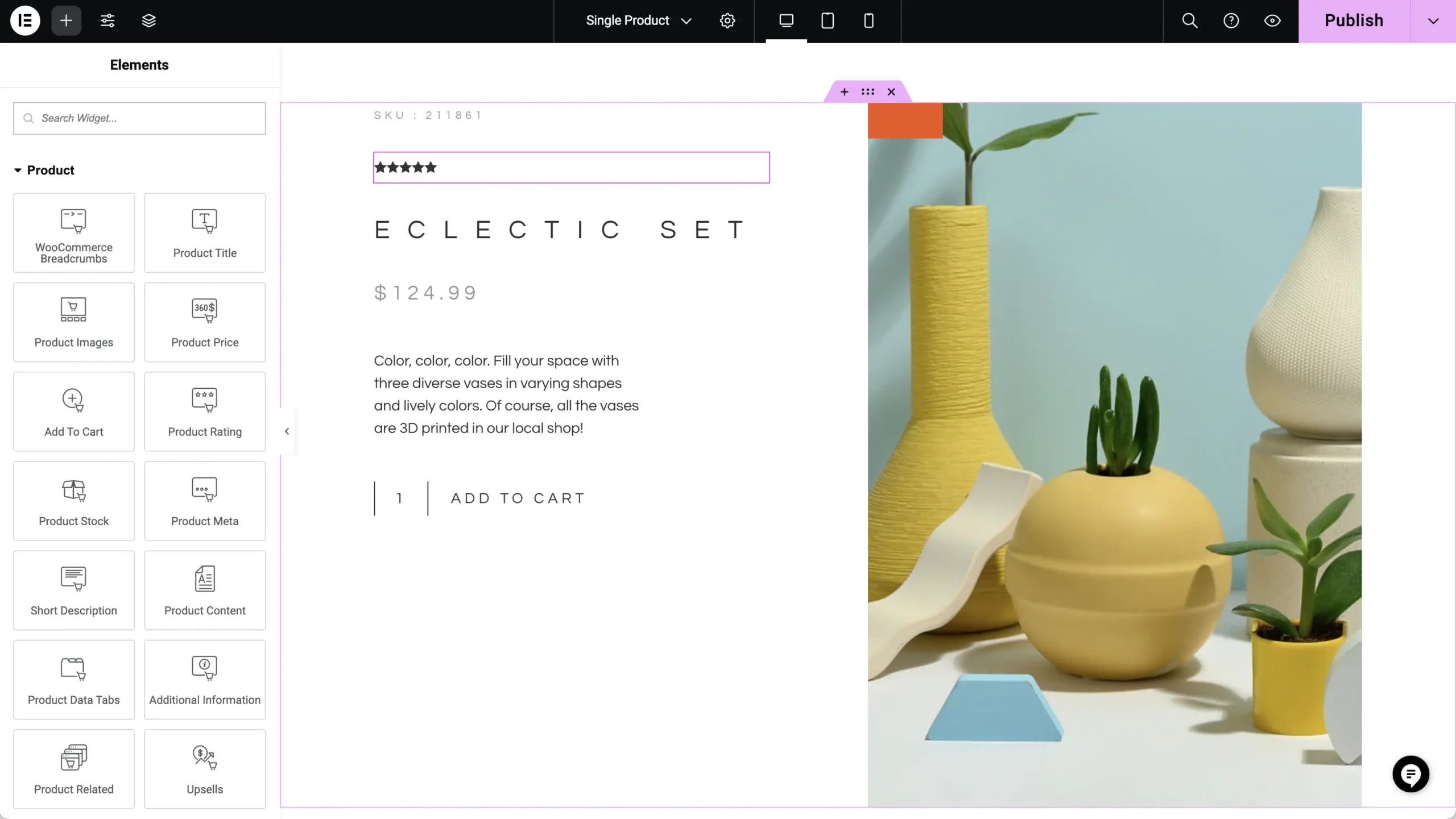 Quickly set up archive or catalog pages using the Products widget with predesigned skins, or construct your own with the Loop Builder. Tailor Single-Product page templates with widgets that automatically fill with product-specific content from WooCommerce.